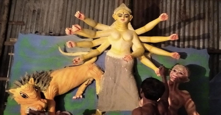 খালিয়াজুরীতে প্রতীমার রং তুলির কাজে ব্যস্ত সময় পার করছেন মৃৎশিল্পীরা