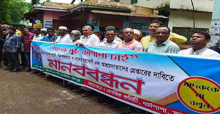 ধর্মপাশায় মাদক সম্রাট ও কিশোরগ্যাং তাদের কে গ্রেপ্তারের দাবিতে মানববন্ধন
