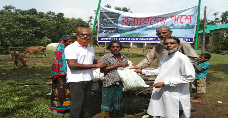 ধর্মপাশায় বন্যা দুর্গতদের মাঝে ত্রাণ সামগ্রী বিতরণ