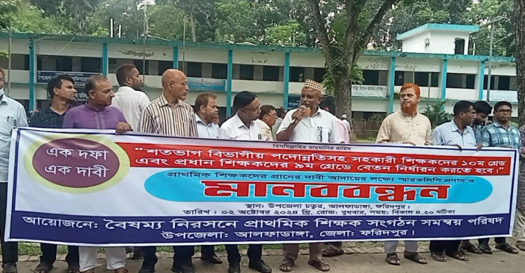 আলফাঙ্গায় প্রাথমিক শিক্ষকদের নবম এবং দশম গ্রেডে বেতন নির্ধারনের দাবিতে মানববন্ধন ও স্মারকলিপি প্রদান
