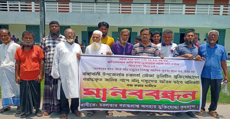 পটুয়াখালীতে অবৈধভাবে বালু কাটার প্রতিবাদে মুক্তিযোদ্ধা কৃষকদের মানববন্ধন
