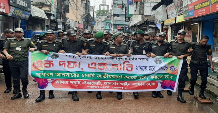 পটুয়াখালীতে চাকরি জাতীয়করণের দাবিতে আনসার সদস্যদের কর্মবিরতি ও বিক্ষোভ মিছিল