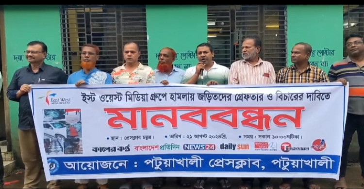 পটুয়াখালী প্রেসক্লাবের উদ্যোগে ইস্ট ওয়েস্ট মিডিয়া গ্রুপে হামলার প্রতিবাদে সাংবাদিকদের মানববন্ধন