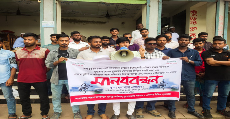 পায়রা তাপ বিদ্যুৎ প্রকল্পে দুর্নীতির সঙ্গে জড়িতদের বিরুদ্ধে ব্যবস্থা এবং ক্ষতিগ্রস্থ পরিবারের সদস্যদের চাকুরির দাবিতে মানববন্ধন