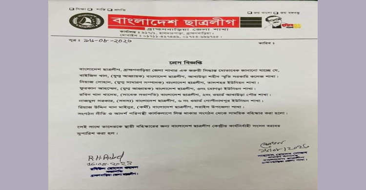 জামায়াত নেতা সাঈদীকে নিয়ে ফেসবুকে স্ট্যাটাস দেওয়ায় ব্রাহ্মণবাড়িয়া ছাত্রলীগের ছয় নেতাকর্মী বহিষ্কার