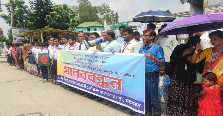 বৈষম্যের প্রতিবাদে পঞ্চগড়ে কিন্ডারগার্টেনের শিক্ষক-শিক্ষার্থীদের মানববন্ধন: "বৃত্তি শুধু টাকা নয়, এটা স্বীকৃতি"