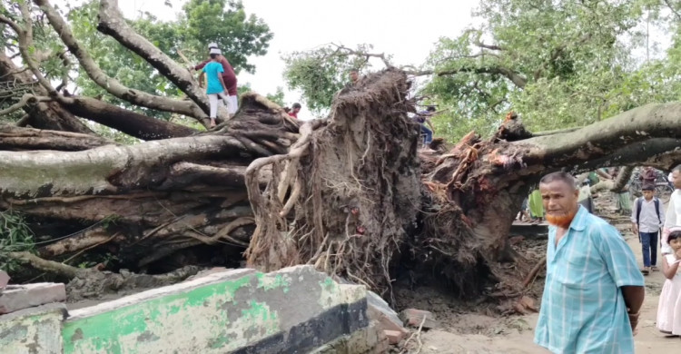 লালমনিরহাটে হঠাৎ ঝড়ের কবলে উপড়ে পড়েছে রহস্যঘেরা হালাবটতলার বটগাছ