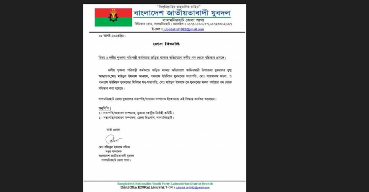 লালমনিরহাটে দলীয় শৃঙ্খলা পরিপন্থী কর্মকান্ডে জড়িত থাকার অভিযোগে ৩ যুবদল নেতা বহিষ্কার