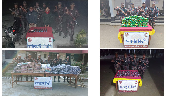 লালমনিরহাট সীমান্তে বিশেষ অভিযান চালিয়ে ৭ দিনে ৩৩ লাখ টাকা মুল্যের মাদকদ্রব্য ও মালামাল আটক করছে বিজিবি