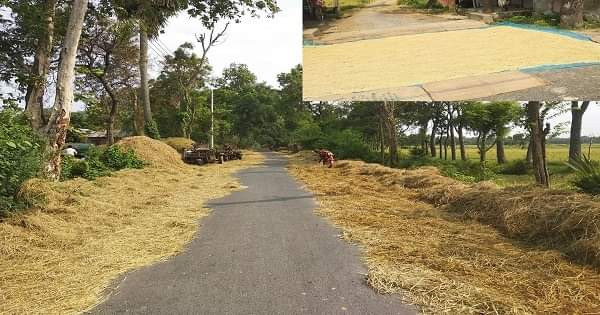 তানোরে সড়ক যেন ধান ও খড়ের চাতাল