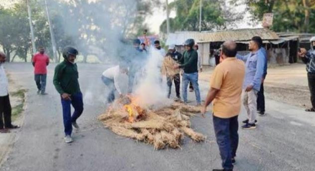 তানোরে অবরোধ সমর্থনে সড়কে খড় জ্বালিয়ে বিএনপির পিকেটিং