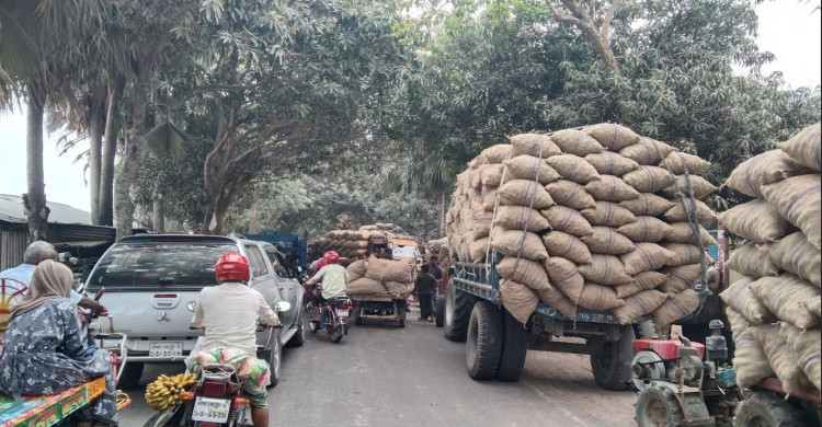 তানোরে কোল্ড স্টোরে আলুর গাড়ির দীর্ঘ লাইন, তীব্র যানজটে ভোগান্তিতে সাধারণ মানুষ