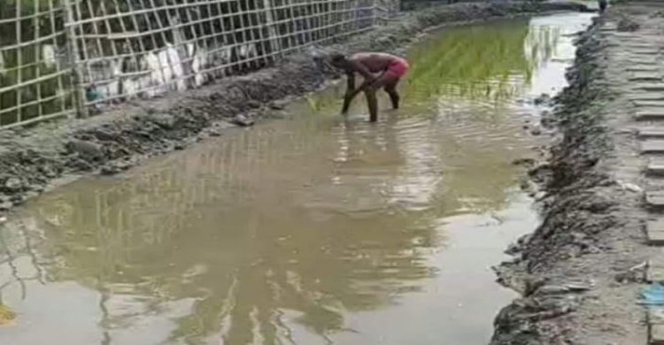 পাইকগাছায় খুড়ে রাখা রাস্তায় পানি জমে খাল: ধানের চারা রোপন করে প্রতিবাদ