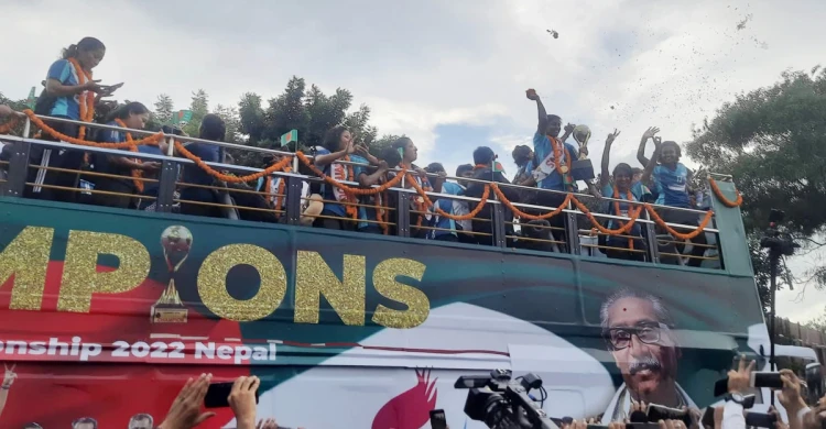 ছাদখোলা বাসে চড়ে বাফুফের পথে ‘সাফ চ্যাম্পিয়ন’ সাবিনারা