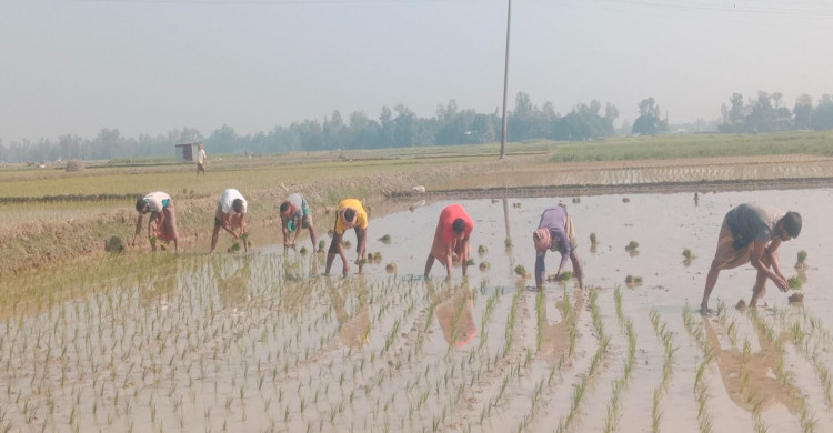 শাহজাদপুরে দলবেঁধে বোরো ধানের চারা রোপণে ব্যস্ত কৃষক