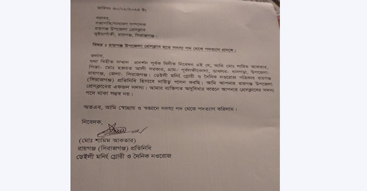 রায়গঞ্জ উপজেলা প্রেস ক্লাব থেকে শামীম আক্তারের পদত্যাগ