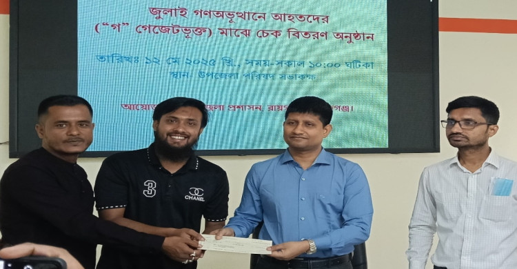 রায়গঞ্জে আহতদের মাঝে চেক ও শহীদ পরিবারের মাঝে সঞ্চয় পত্র বিতরণ