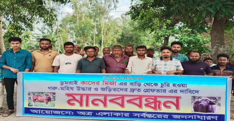রায়গঞ্জে চুরি হওয়া গরু-মহিষ উদ্ধারের দাবিতে মানববন্ধন