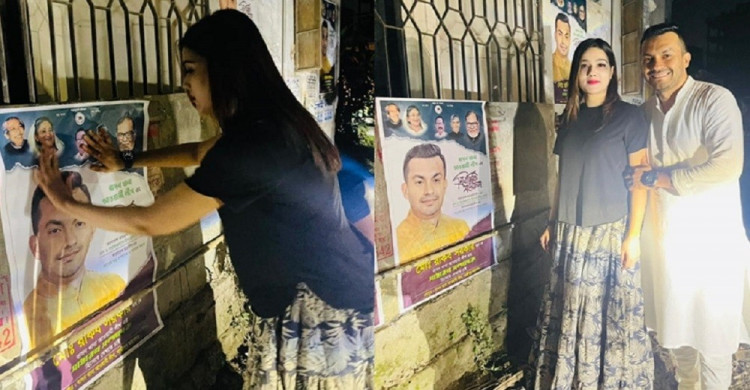 স্বামীর জন্য পোস্টার লাগাচ্ছেন মাহি (ভিডিও)