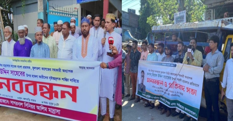 জুড়ীতে কলেজ শিক্ষকের উপর হামলার প্রতিবাদে মানববন্ধন