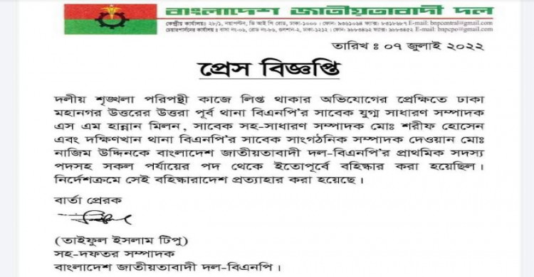 উত্তরায় বিএনপির ৩ নেতার বহিষ্কারাদেশ প্রত্যাহার