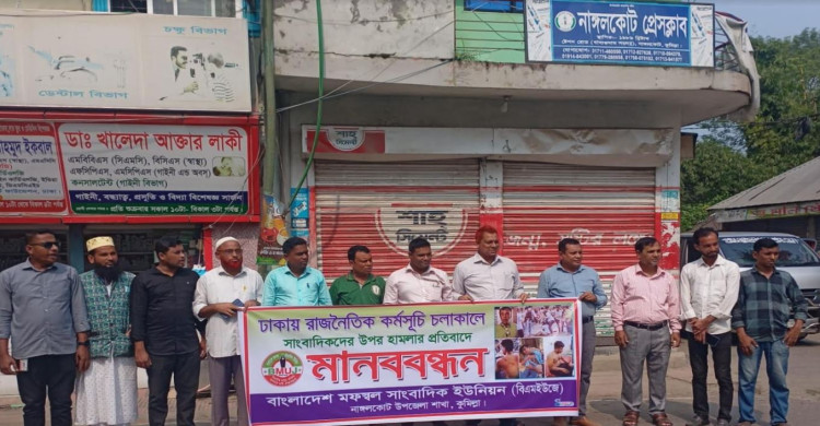 ঢাকায় রাজনৈতিক কর্মসূচিতে সাংবাদিকদের ওপর হামলার প্রতিবাদে নাঙ্গলকোটে মানববন্ধন