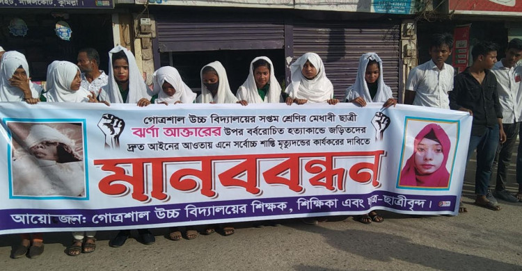 নাঙ্গলকোটে সপ্তম শ্রেণীর ঝর্ণা আক্তারের হত্যাকারীদের ফাঁসির দাবিতে মানববন্ধন