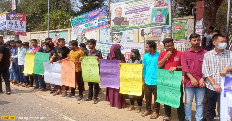 কাপ্তাইয়ে সড়ক দুর্ঘটনায় নিহত ছাত্র সালেহীনের মৃত্যুর প্রতিবাদে সহপাঠীদের মানববন্ধন