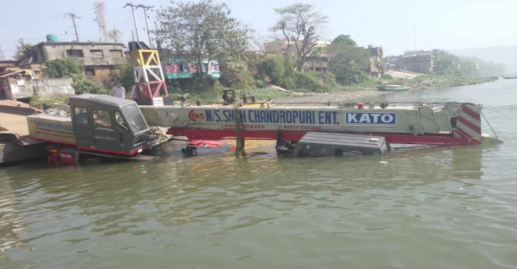 ড্রেজিং এর জন্য আনা ক্রেন নদীর পানিতে পড়ে গেল, চন্দ্রঘোনায় ফেরী চলাচল বন্ধ