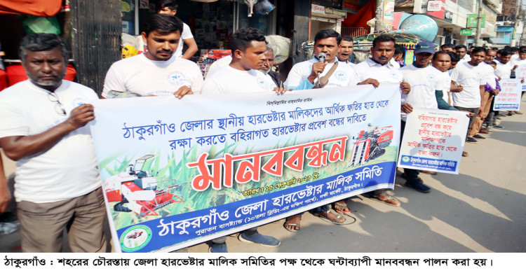 ঠাকুরগাঁওয়ে হারভেষ্টার বন্ধের দাবিতে মানববন্ধন