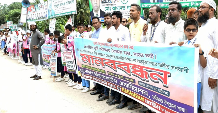 কিন্ডারগার্টেন শিক্ষার্থীদের বৃত্তি পরীক্ষায় অংশগ্রহণের দাবিতে ফরিদগঞ্জে মানববন্ধন