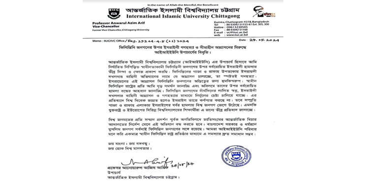 ইসরাইলী গনহত্যা ও আগ্রাসনের বিরুদ্ধে আইআইইউসি উপাচার্যের বিবৃতি