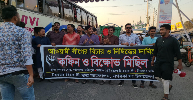 আ.লীগকে নিষিদ্ধের দাবিতে নগরকান্দায় ছাত্রদের খাটিয়া মিছিল